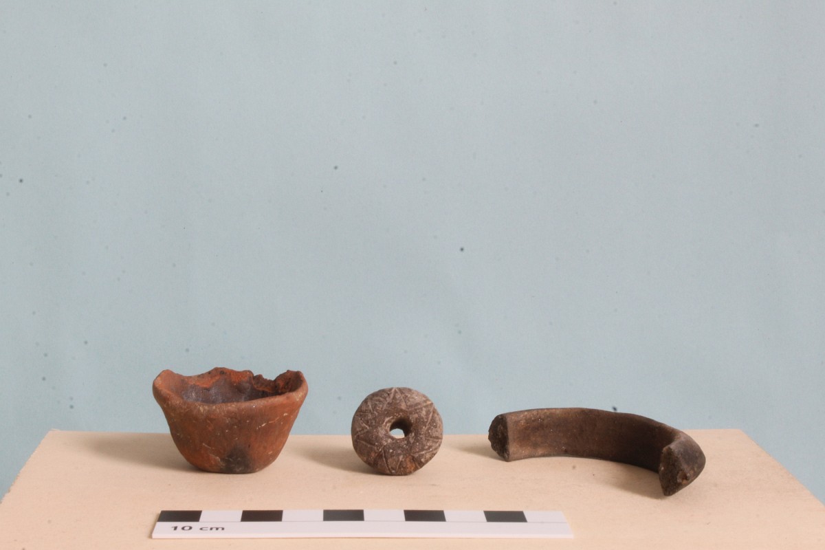 Funde aus dem steinzeitlichen Dorf von Spitzlberg. Von Links: Ein kleines Trinkgefäß, ein Spinnwirtel und das Fragment eines Armreifes aus Ton (Foto: Kreisarchäologie Landshut).