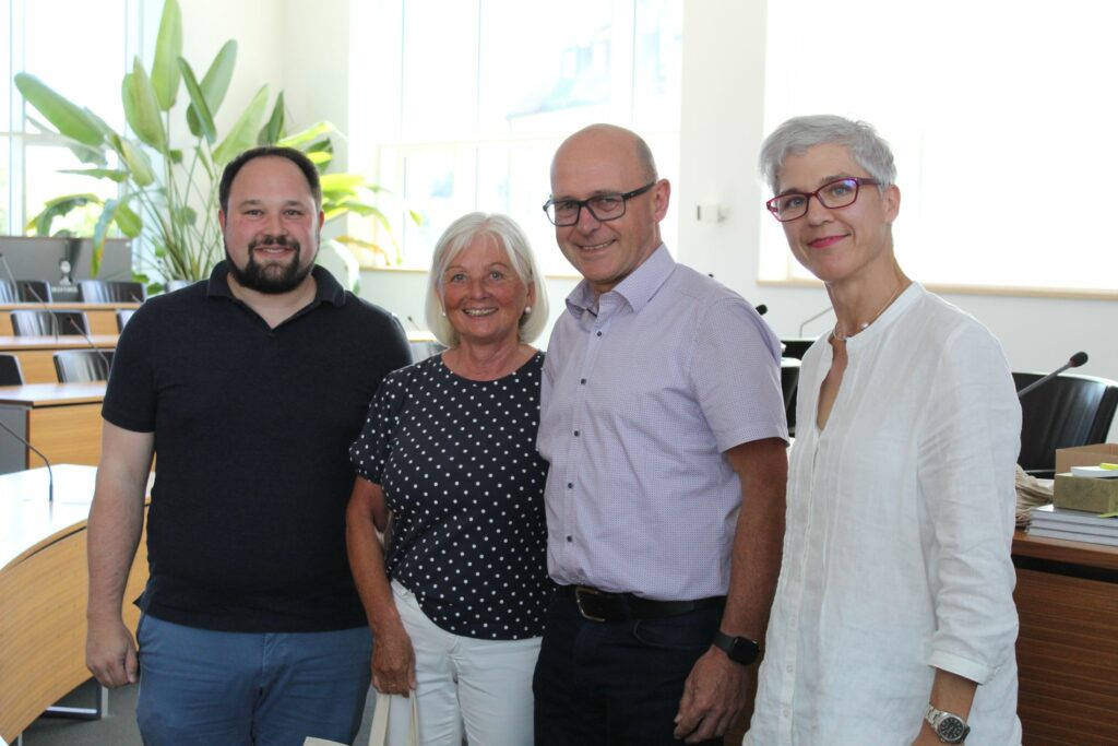 Eva Brunner (l.), Tourismus Landkreis Landshut, und stellv. Landrat Sebastian Hutzenthaler (r.) überreichten Sabine Gröger, Zweite Bürgermeisterin, und einem Teilnehmer stellvertretend für die Gemeinde Buch am Erlbach, die Auszeichnung zum ersten Platz.