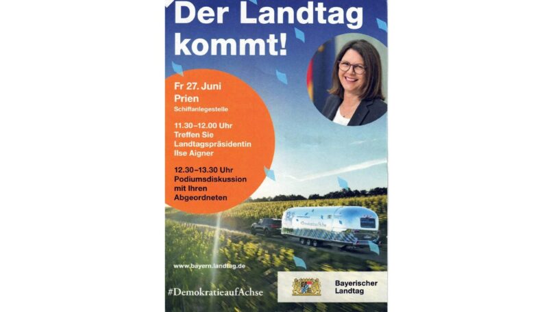 Am Freitag, 27. Juni ist der Bayerische Landtag in Prien am Chiemsee zu Gast. Im Rahmen der Veranstaltungsreihe „Der Landtag geht aufs Land“ besteht die Gelegenheit, die Arbeit des Parlaments näher kennenzulernen.