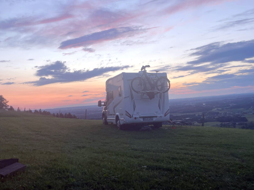 Bericht: Blauer Gockel/Urlaub auf dem Bauernhof – Foto: Hötzelsperger (Camping mit Abendstimmung auf dem Samerberg im Rosenheimer Land)