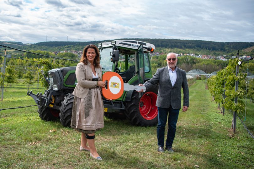 Praktizierter Klimaschutz im Obstbau: Landwirtschaftsministerin Michaela Kaniber hat der Landesanstalt für Weinbau und Gartenbau (LWG) in Thüngersheim einen für Biodiesel tauglichen Traktor übergeben. „Durch die Verwendung von Biodiesel werden im Vergleich zu Mineralöldiesel gut 80 Prozent Treibhausgase eingespart. Zudem wird der Biodiesel aus Pflanzen direkt vor unserer Haustüre gewonnen, was im Vergleich zum Mineralöl lange Transportwege erspart und Ressourcen schont“, sagte die Ministerin. Und weiter: „Wir wollen mit innovativer Technik als Freistaat Vorbild sein für die privaten Erzeuger. Wir nehmen Klimaschutz sehr ernst.“