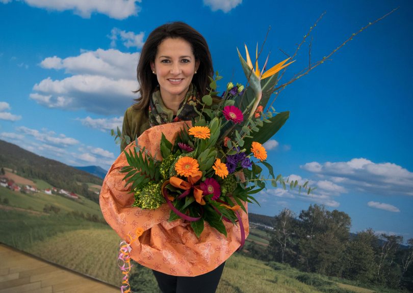 Foto zeigt Ministerin Michaela Kaniber mit einem Blumenstrauß – von Judith Schmidhuber / StMELF