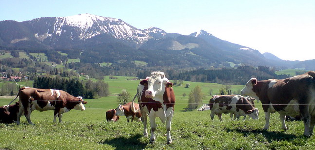 Foto: Hötzelsperger – Samerberger Kühe mit schneebedeckter Hochries