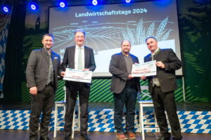 Vorstand Roland Seidl und Leiter Agrar Andreas Gasteiger (jeweils außen) bei der Scheckübergabe an Franz Obermayer (Vertreter FOX helps e.V., Zweiter von links) und Kreisobmann des bayerischen Bauernverbandes in Rosenheim, Josef Andres (Zweiter von rechts).