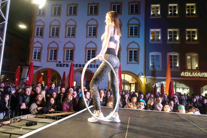 Veranstalter war das Rosenheimer City-Management in Zusammenarbeit mit zahlreichen Partner. Die Freude darüber, dass nach Jahren Coronabedingter Einschränkungen diese Veranstaltung heuer wieder in vollem Umfang stattfinden konnte und dann auch noch das Wetter so fabelhaft mitspielte, war groß, wie Rosenheims Citymanagerin Sabrina Obermoser bei ihrer kurzen Ansprache bei der zweiten Open-Air-Modenschau des Abend um 9 Uhr sagte. Der Max-Josefs-Platz war zu dieser Zeit so voll wie selten. Durchkommen kaum noch möglich. Die Modenschau im Freien ist ganz klar der Höhepunkt der „Rosigen Zeiten“. Gezeigt wird die Herbst- und Wintermode mit allem was dazu gehört. Überall in der Stadt gab es etwas zu entdecken und zu erleben. Besonders gemütlich war die Stimmung im Salinplatz. Laser tauchten den Platz in eine mystische Atmosphäre. Feuerschalen mit Liegestühlen drumherum sorgten für Lagerfeuerromantik und nebenbei verwandelten sich dank ausgeklügelter Lichtshow von Urs Hasler die Hausfassaden in bewegte Gemälde. Im Salingarten gab es heuer einen neuen Effekt. Eine Kugel mit Lasereffekten schwebte scheinbar über dem Boden. Außerdem zählte da der aus Lichtpylonen geformte Schriftzug „Rosenheim“ sicher zu einem der am meisten fotografierten Motive. Viel los bis zum Ende der Veranstaltung um 23 Uhr war auch am Salzstadel. Dort fand die „Silent Disco“ statt. Am Grünen Markt wurde eine Hausfassade ebenfalls kunstvoll in Szene gesetzt. Geheimtipp war dort eine Lichtinstallation in einem Hinterraum. Dort waren hauchdünne Netzstoffe gespannt, die dank aufwendiger Projektion von Formen und Effekten für eine ganz besondere Atmosphäre sorgen. Die Rosenheimer Geschäftswelt hat sich für diesen Abend ebenfalls wieder einiges für die Besucher überlegt. In einigen Läden gab es Sekt und Häppchen, andere boten Sonderrabatte an und gaben kleine Geschenke mit.