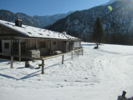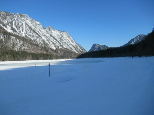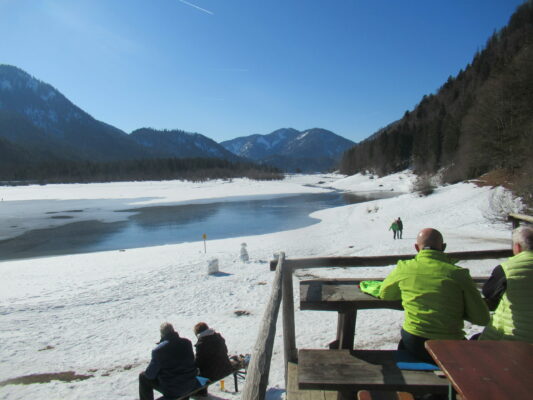 Die 3-Seen-Loipe zwischen Ruhpolding und Reit im Winkl ist wirklich eine der schönsten und schneesichersten Loipen im Chiemgau.  Um den Weitsee, Mittersee und Lödensee ist gespurt und für Wanderer und Skater gewalzt und bis auf wenige Stellen kann man zwischen Weitsee und Förchensee recht gut zu laufen. Nur westlich vom Mittersee von der Mitterseealm in Richtung Lödenboden geht es zwar, hier ist es aber nicht empfehlenswert.  Auf der sonnigen Terrasse der Mitterseealm, waren zahlreiche Sonnenanbeter, die das Panorama und eine gute Brotzeit zu genossen.