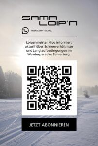 Nico vom Loipen-Team versorgt Euch in seinem neuen, privaten WHATSAPP-Kanal “Sama Loip´n” mit Infos direkt aus dem Pistenbully. (Einfach QR-Code scannen.)