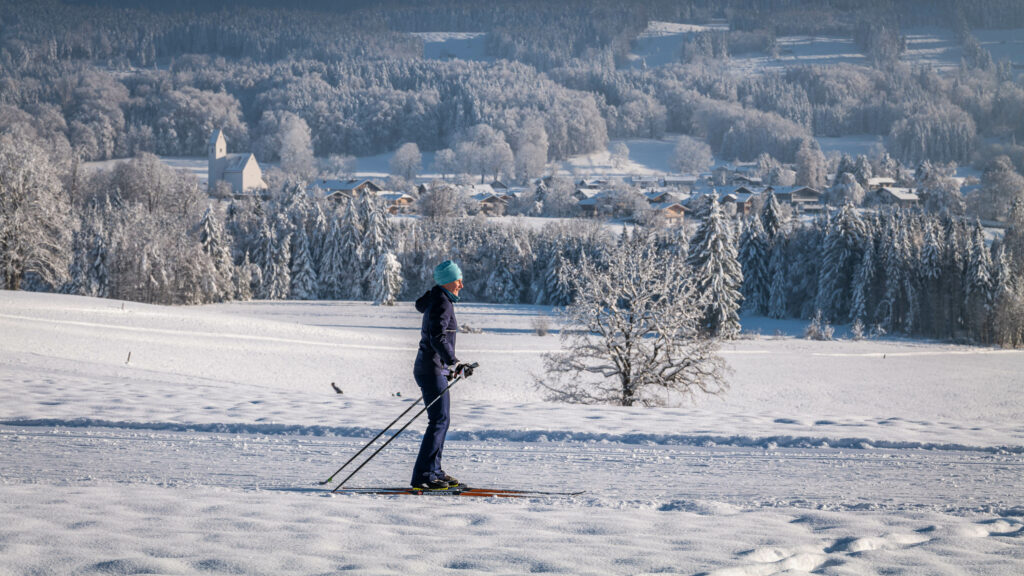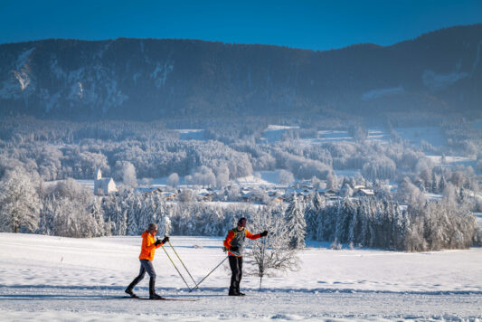Auf dem Samerberg in Oberbayern offenbart sich derzeit ein wahres Wintermärchen für Skilangläufer. Die bestens gespurten Pisten des Hochtals laden zu einem unvergesslichen Naturerlebnis ein, das durch das strahlende Winterwetter noch zusätzlich veredelt wird.