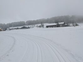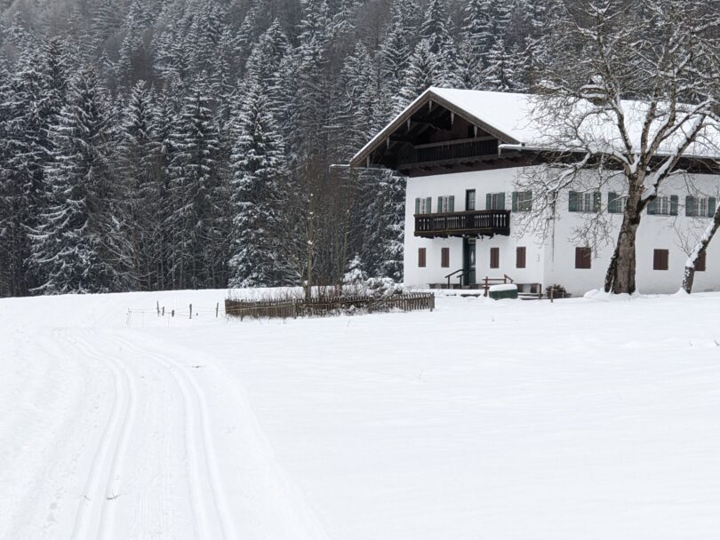 Ich parke am Wanderparkplatz Aigen, wo einige Autos von Skitourengehern und Rodlern, die hinauf zur Maisalm wandern, stehen. Ich laufe zuerst die „Achter-Runde“ rund um ein ehemaliges Bauernhofanwesen. Die Bäume sind weiß überzuckert, es ist ein Traum. Die Spur ist ganz gut, Skating geht auch. Dann laufe ich auf der wilden Spur durch die in herrliches Weiß gehüllte Landschaft bis Hintergschwendt, wo die Runde auch recht gut zu laufen ist.