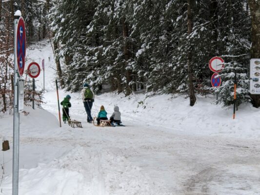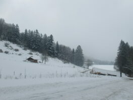 Seit einer Woche ist auch in Hintergschwendt die Loipe gespurt, also auf ins Winterwunderland am Fusse der Kampenwand. Die Loipe ist zwar nicht sehr lang, aber eine meiner Lieblingsloipen, weil man von Prien aus schnell dort ist und nie viel los ist. Die Straße hinauf nach Hintergschwendt ist schneefrei und gleich nachdem Ortsschild sehe ich die Spur, die ganz gut aussieht, aber vor der Hütte, in der das Spurgerät untergestellt ist, endet. Ab hier ist nur noch eine wilde Spur.