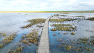 Der Holzbohlenweg im Langwarder Groden schwebt über dem Wasser. Es ist Flut und die Nordsee reicht bis zum Rande des Stegs. Selbst bei Hochwasser lassen sich einige Pflanzen erblicken. / Foto: Tourismus-Service Butjadingen