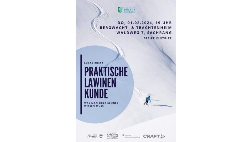 Am Donnerstag, 1. Februar 2024, berichtet um 19 Uhr im Bergsteigerdorf Sachrang der für seine außergewöhnlichen Touren bekannte Sportler Lukas Ruetz über Lawinen. Dabei behandelt er Themen wie “Wie gehe ich mit den fünf Lawinenproblemen um?”, “Was sagt mir der Lawinenlagebericht?”, “Wie bewege ich mich sicher in den Bergen?” und “Wo finde ich die besten Schneeverhältnisse?”.