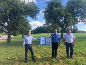 Von Links: Den Verlauf der künftigen Radstrecken erläuterte Bürgermeister Konrad Linner bei der Entgegenahme des Förderbescheids dem LEADER-Koordinator Johann Kölbl vom Amt für Ernährung, Landwirtschaft und Forsten Rosenheim und dem Vorsitzenden der LAG Chiemgauer-Seenplatte Sepp Reithmeier. Foto: Christa Auer