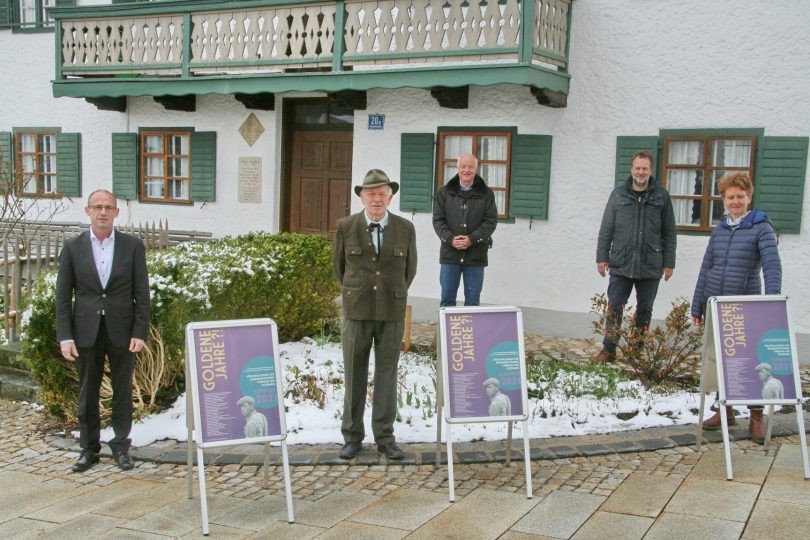 Foto: Otto Humm:  Präsentieren die LEADER-geförderten Aufsteller der Museumsnetzwerke Rosenheim und Traunstein mit dem Kulturprojekt „Goldene Jahre“ vor dem Chieminger Heimathaus: (Von links) Chiemings Bürgermeister Stefan Reichelt, Ortsheimatpfleger Hubert Steiner, Kulturreferent des Landkreises Rosenheim, Christoph Maier-Gering, LAG-Manager der Chiemgauer Seenplatte, Christian Fechter und  die Projektleiterin der „Goldenen Jahre“ Michaela Firmkäs