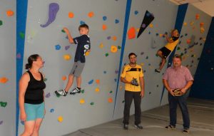 Angeleitet von Agnes Niederthanner haben Magdalena Guggenhuber, Valentin Mayer und viele andere Jugendliche und Kinder im Pittenharter Ferienprogramm die neue Boulderwand der SpVgg Pittenhart getestet und ihren Spaß gehabt. Bürgermeister Sepp Reithmeier gratulierte dem Vereinsvorstand Sigi Obermaier zum gelungenen LEADER-Projekt. Foto: LAG Chiemgauer-Seenplatte