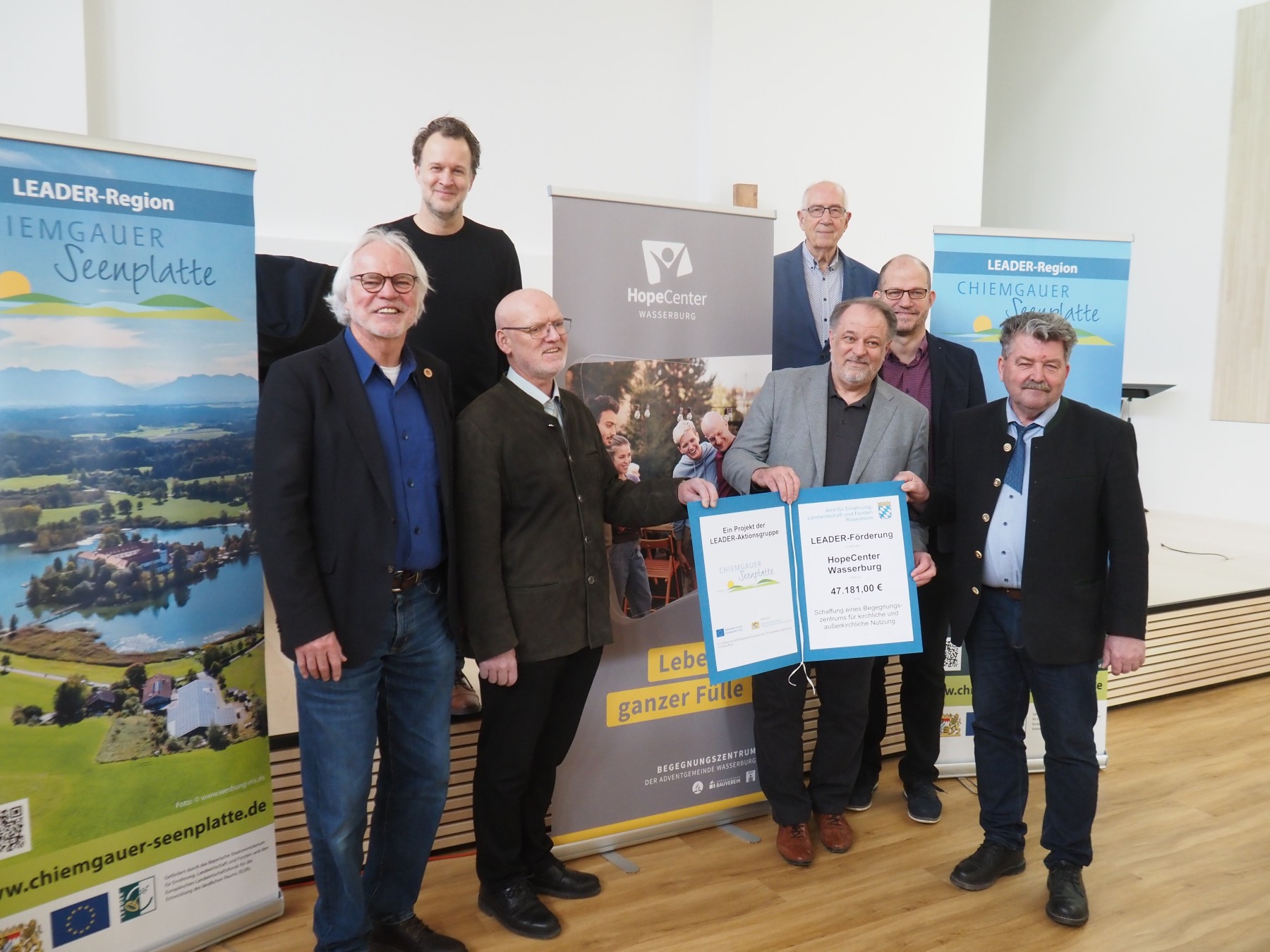 von links: Werner Gartner, Zweiter Bürgermeister von Wasserburg, LAG-Manager Christian Fechter, Johann Kölbl vom Amt für Ernährung, Landwirtschaft und Forsten, Pastor Branko Bistrovic (vorne), Hayo Giebel, Mitglied im Bauausschuss (hinten), Matthias Fenner, Gemeindeleiter der Adventgemeinde und Sepp Reithmeier, Vorsitzender der Lokalen Aktionsgruppe Chiemgauer Seenplatte. Foto: Winfried Weithofer