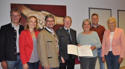 Überreichung des LAG Förderbescheides über 48 000 Euro im Foyer des Mehrgenerationenhauses Flintsbach unter dem Emblem (helfende Hände) des Christlichen Sozialwerks Degerndorf – Brannenburg – Flintsbach. V. li n. re. Matthias Jokisch Erster Bürgermeister Brannenburg u. Zweiter Vorsitzender CSW, Gwendolin Dettweiler LAG Managerin, Stefan Lederwascher Erster Bürgermeister Flintsbach u. Erster Vorsitzender CSW, Sebastian Wittmoser LEADER Koordinator des Amts für Landwirtschaft und Forsten, Monika Kaiser Fehling geschäftsführende Pflegedienstleiterin CSW, Sebastian Wiesener Projektmanager „MehrgenerationenSPORT – fit für 100“, Annemarie Biechl Landtagsabgeordnete a.D. Vertreterin der LAG