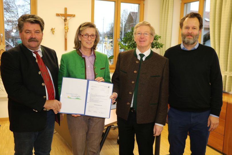 Bericht und Foto: Heinrich Rehberg – Bildunterschrift: Landwirtschaftsdirektor Sebastian Wittmoser (zweiter von rechts) vom Amt für Ernährung, Landwirtschaft und Forsten in Rosenheim und der erste Vorsitzende der LAG Chiemgauer-Seenplatte Bürgermeister Sepp Reithmeier (links) brachten 9713 Euro Fördermittel aus dem Leader-Topf mit ins Frasdorfer Rathaus und überreichten Bürgermeisterin Marianne Steindlmüller (zweite von links) den Zuwendungsbescheid für das vorgesehene Projekt. LAG Manager Christian Fechter von der LAG Chiemgauer Seenplatte (rechts) und der Frasdorfer Gemeindearchivar Rupert Wörndl hatten das Projekt in zahllosen Besprechungen haarklein vorbereitet, so dass es alle Anforderungen der Förderer erfüllte.