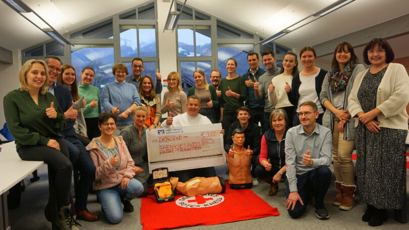 meine Volksbank Raiffeisenbank eG unterstützt mit 1.000 Euro   –   „Ein Unglücksfall kann uns in jedem Moment herausfordern, Erste Hilfe leisten zu müssen.  Darauf müssen wir auch als Laien immer gut vorbereitet sein“, mit diesen eindringlichen  Worten begrüßte Referent Thorsten Münch vom Bayerischen Roten Kreuz Traunstein die  Mitarbeiterinnen und Mitarbeiter der meine Volksbank Raiffeisenbank eG in Grassau zum  „Lebensretter 112“-Auffrischungskurs.