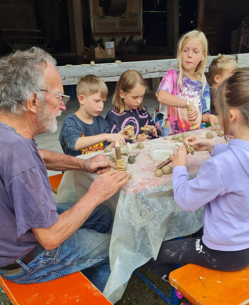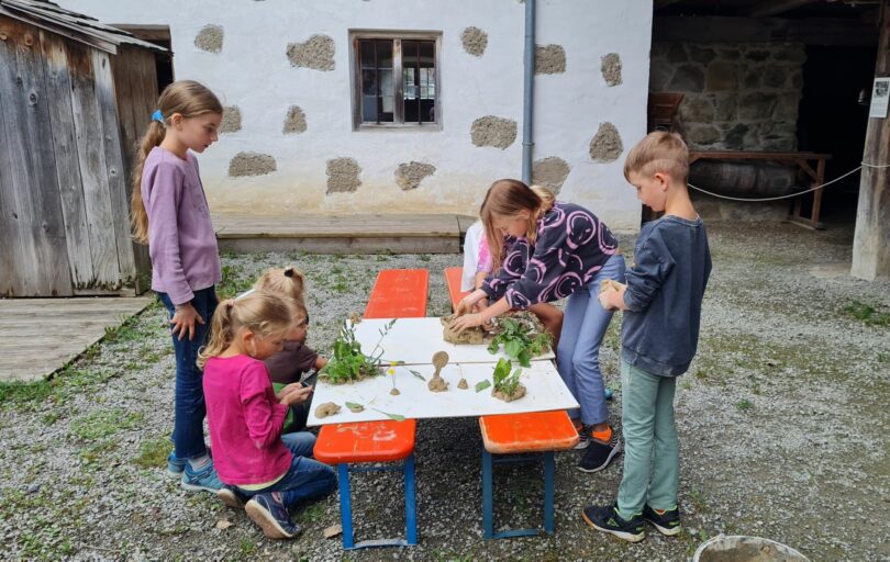 Doch zu Beginn hieß es erst einmal Üben. Zum Einstieg formte jedes Kind einen Pilz. Um das Ganze zu erleichtern, bastelten sich alle einen Pilz aus Holz und umwickelten ihn mit einer Schnur. Darüber wurde nasser Lehm geschichtet. So entstanden die ersten Lehm-Schwammerl, die in der Luft getrocknet wurden. Sehr schnell zeigte sich: Hier sind keine Laien an Bord! Die Geschwister Ferdinand und Clara etwa haben schon oft mit Ton oder Lehm gebastelt. „Der Lehm fühlt sich einfach so toll an“, schwärmte die Siebenjährige. „Er ist so schön weich, da macht das Kneten richtig Spaß.“ Erste Erfahrungen sammelte sie mit einem Herz und einem Huhn aus Ton. Im Bauernhausmuseum sollte es eine Schildkröte sein. Ferdinand dagegen wusste gleich, dass er einen Bären und einen Hund gestalten will.
