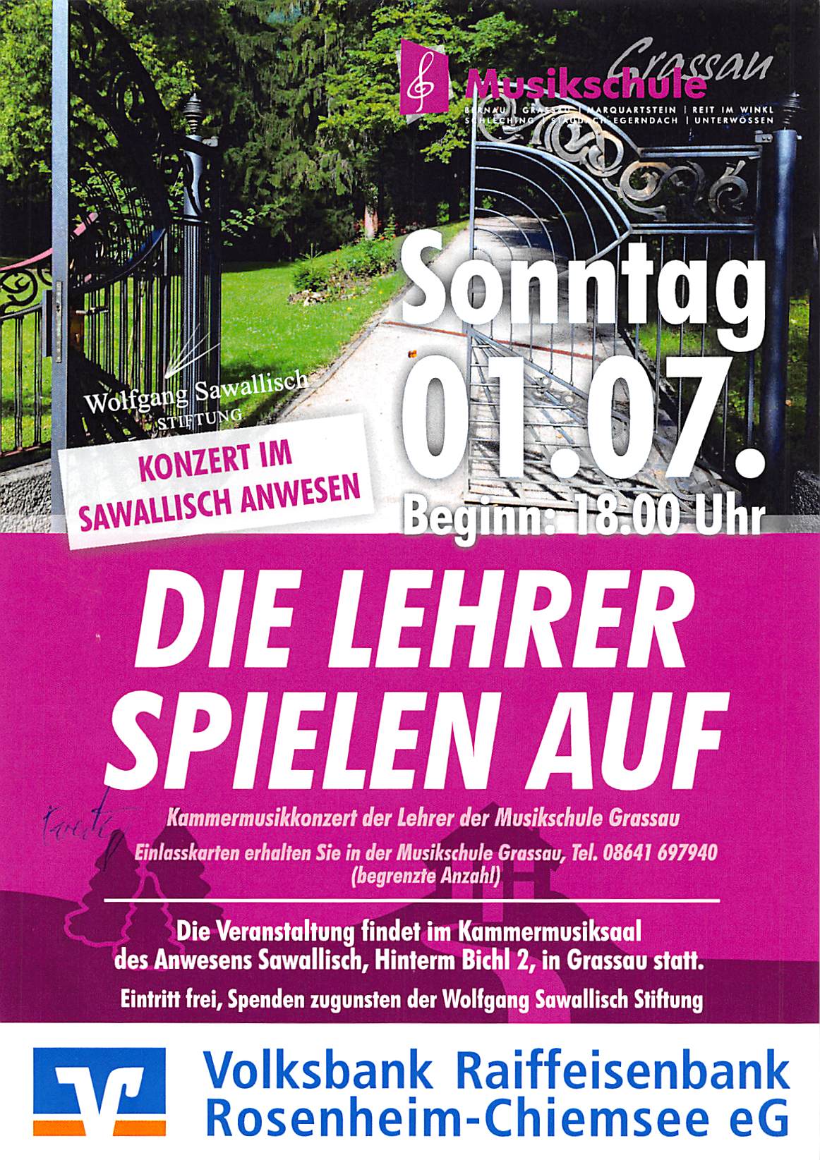 Unter dem Titel „Die Lehrer spielen auf“ geben die Lehrer der Musikschule Grassau alljährlich ein Kammermusikkonzert im Anwesen Sawallisch, Hinterm Bichl 2. Das Konzert beginnt am Sonntag, 1. Juli, 18 Uhr, im dortigen Kammermusiksaal.