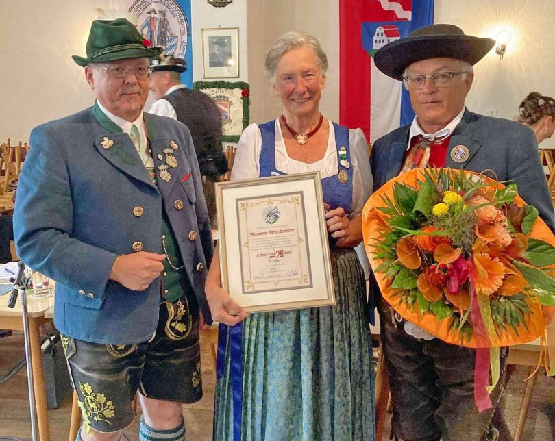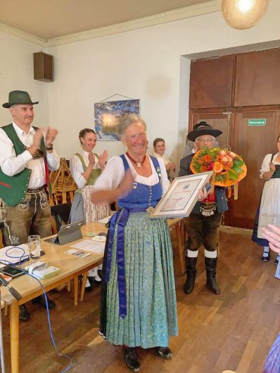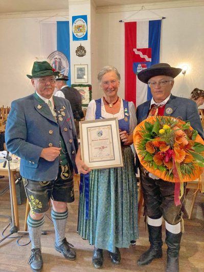 Dass sie jetzt auch zum Ehrenmitglied des Altbayrisch-Schwäbischen Gauverbandes ernannt wurde ist natürlich Freude und Verantwortung für die Zukunft. Jetzt genießt sie ihren trachtlerischen Ruhestand ohne Verantwortung und wieder gutem Schlaf. Auf ihrem Ebike ist sie in ganz Bayern unterwegs und hofft auf weitere schöne Jahre.