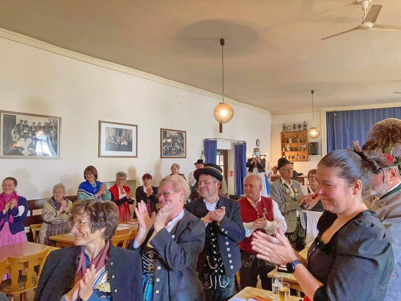 Die Initiatoren freuten sich diebisch, dass es ihnen gelungen ist, dies geheim zu halten. Natürlich weiß die Geehrte, dass diese Lehrer-Vogl-Medaille schon was Bsonders ist und die Freude darüber war ihr sichtlich anzusehen. Aber diese Ehrung kommt nicht von ungefähr. Blank jeder Kenntnis um Tracht und Brauchtum lernte sie während ihrer Ausbildung zur Verwaltungsbeamtin in der Bayerischen Verwaltungsschule Holzhausen am Ammersee ihren Mann Gerhard kennen, ein pränataler Trachtler, schon mit der Lederhose auf die Welt gekommen. „Wenns was werden soll mit uns, dann muasst mitmacha“ war seine Ansage. Und sie machte mit! Schnell lernte sie das Trachtlerleben mit all seinen Facetten lieben und war über Jahrzehnte ihrem Mann Gerhard eine zuverlässige Stütze. Aber sie ergriff selbst die Initiative, machte sich in ihrem Lechhauser Verein nützlich und stieg 1980 auch in die Gauarbeit ein. Zuerst als Dirndlvertreterin u. a. mit der Abhaltung von diversen Nähkursen, der Einführung der Miedernäherei im Gau und immer im Blick das saubere Auftreten der Deandl, dann entdeckte sie ihre Lust am Schreiben und übernahm das Amt des Pressewartes. In diese Zeit fiel auch die Neuaufnahme der Arbeiten rund um eine – schon immer gewünschte – Gauchronik. Unterstützt von Alexandra Oppenländer, Martin Kramer, Marianne Sandmeier und Konrad Vogel war es nach zweijähriger intensiver Arbeit so weit: Die Gauchronik konnte 1998 präsentiert werden.