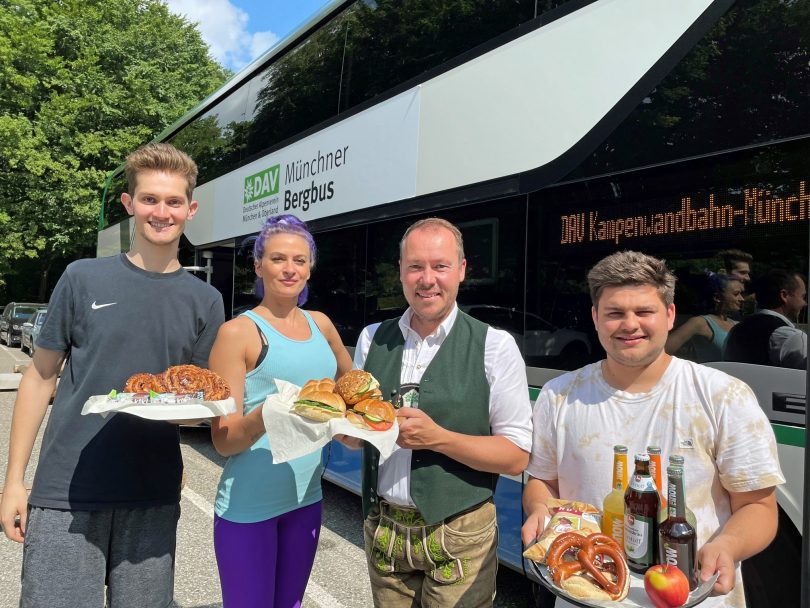 Nicht nur für umweltverträgliche Mobilität steht der Münchener Bergbus: Bringt er doch regelmäßig Bergbegeisterte auf verschiedenen Routen in bekannte Ausflugsziele. So werden die Regionen entlastet, die Bergsteiger können entspannt anreisen und viele nützliche Informationen gibt es obendrauf. Nun kommt auch noch die Unterstützung regionaler Anbieter dazu: Bei seiner letzten Fahrt hat der Münchner Bergbus seinen Fahrgästen einen besonderen Verpflegungsservice auf der Chiemgau-Route angeboten. Das Angebot reichte von belegten Semmeln und Nussschnecken über Butterbrezen bis hin zu kühlen Getränken wie Limonaden – und das bio und fair zugleich. Der Verkauf wurde von einem Studierendenteam im Rahmen vom Innovationsprogramm Academic Program for Entrepreneurship des Strascheg Center for Entrepreneurship der Hochschule München durchgeführt. Der Unternehmenspartner Naturland Fair hat den Verkauf unterstützt. Diesen besonderen Service und Angebot freute auch die örtlichen Touristiker und so begrüßte der Leiter der Tourist Info Aschau im Chiemgau, Herbert Reiter (Zweiter von rechts), die kulinarische Fahrt im Genussort Aschau i.Chiemgau an der Talstation der Kampenwandseilbahn. Das Angebot hat guten Anklang bei den Fahrgästen gefunden und ein Dank gilt allen Unterstützern sowie Sponsoren.