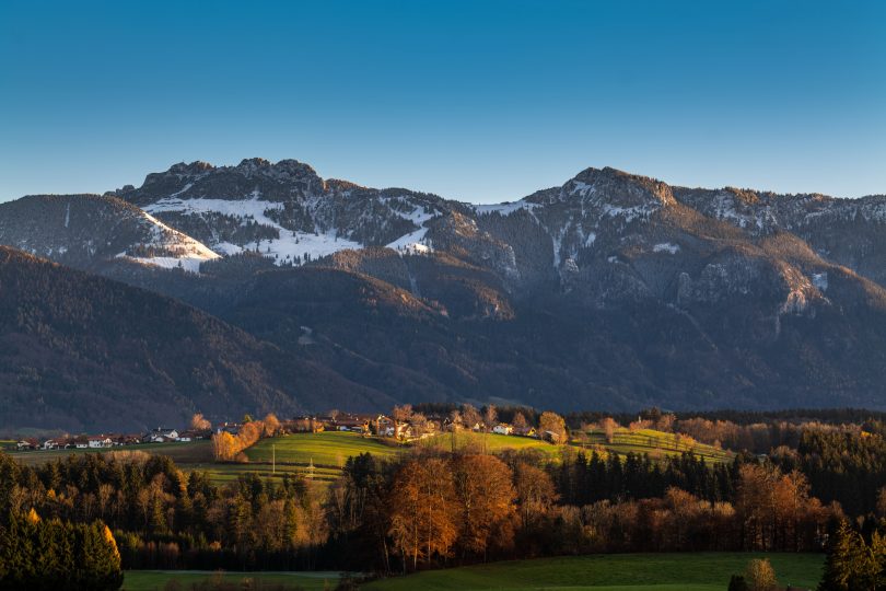 Der Kampenwand, dem Hausberg der Chiemgauer und Chiemseer ist in der Gemeinde Frasdorf der Ort Leitenberg vorgelagert. Wie sehr sich bei schönen Wetterlagen dabei vom richtigen Standpunkt aus ein stimmiges Landschaftsbild ergeben kann, zeigen diese aktuellen Bilder – mit und ohne dem Ort.