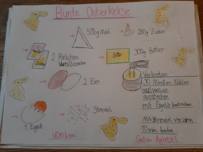 Die Kekse schmecken Leni und ihren Geschwistern so gut, dass sie ihr Rezept gerne an alle Schulkinder weitergeben möchte. Damit das Nachbacken allen gelingt, hat sie das ganze Rezept KINDGERECHT AUFGEMALT und BESCHRIFTET. Viel Spaß beim Nachbacken wünscht Leni!