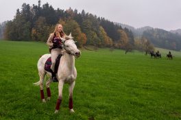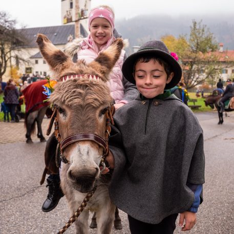 der Gott macht eben einen Umweg über Eltern oder Omas oder sonst Jemanden. Ich meine, eine wesentliche Aussage über das Segnen! Der Segen Gottes kann seine Wirkung am besten entfalten über andere Menschen. Als gesegneter Mensch darf ich dem anderen zum Segen werden. Das heißt konkret, nach jedem Gottesdienst, muss jeder hinaus gehen und die Absicht haben, andere Menschen zu schützen, zu behüten und dafür zu sorgen, dass es dem anderen gut geht. Denn dann geht es mir auch gut! Und dem heiligen Diakon Leonhard ist das besonders gut gelungen. Er hat segensreich gewirkt und ist für Kranke, Gefangene, Arme und auch für die Fürsten seiner damaligen Zeit dagewesen. Und wenn wir heute auf seine Fürsprache den Segen Gottes auf die Pferde und die Tiere herabrufen, bedeutet das, dass die Menschen, welche für sie sorgen, darauf achten, gut mit ihnen umzugehen und sich die Tiere so wohlfühlen. Aber vergessen wir nicht, nicht nur die Pferde werden gesegnet, sondern auch wir am Ende des Gottesdienstes. Also: es gehen nur gesegnete Menschen von dieser Wiese weg. Ob wir das dann beim Essen im Feuerwehrhaus und dann auch noch Zuhause spüren?“ – so Diakon Günter Schmitzberger, der alsdann die Segnung von Rosserern und Reitern vornahm und der eine Umfahrt um die Kirche „St. Bartholomäus“ zusammen mit seinen Ministranten in der Kutsche sichtlich genoss. Den Abschluss des Tages nahm ein gemütliches Beisammensein mit Musik, Goaßlschnalzereinlagen und guter Bewirtung im Feuerwehrhaus.