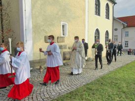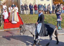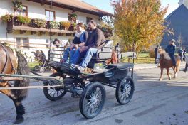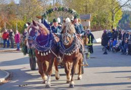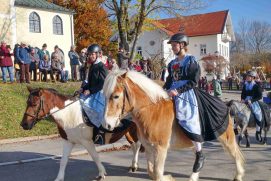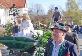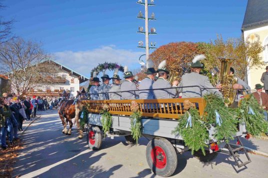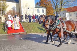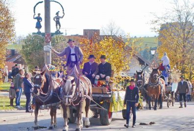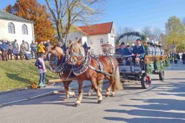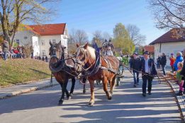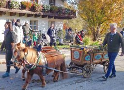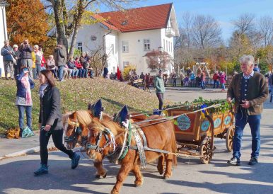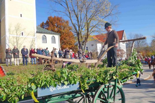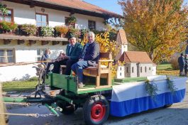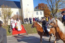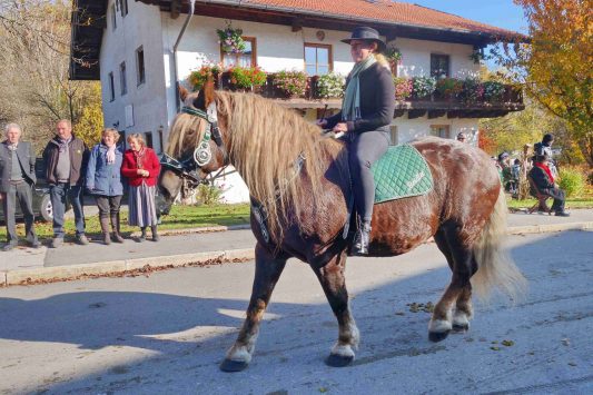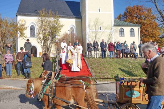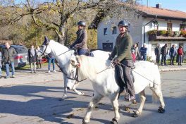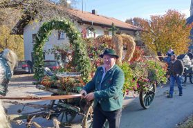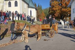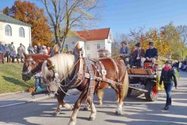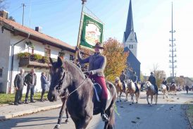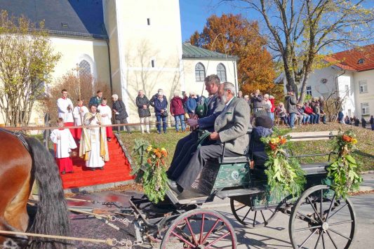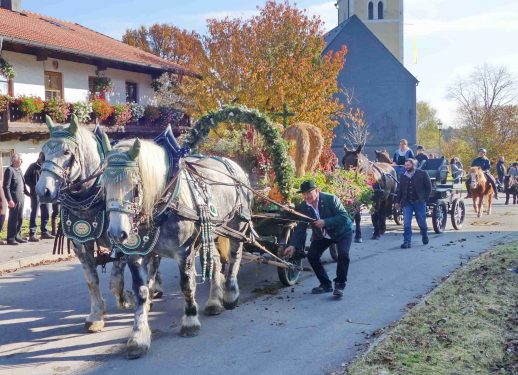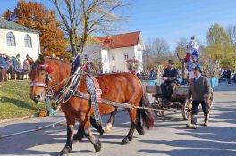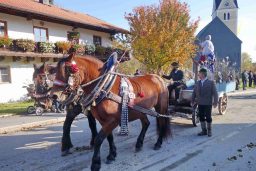 Sebastian Mayer vom Fürstnerhof von Fürst bei Greimharting, seit Kindheit alljährlich beim Leonhardiritt dabei, hat von seinem Vater die Ehre übernommen, für die Bürgermeister-Prominenz von Greimharting und Umgebung beim Umritt einzuspannen. Er zeigte sich begeistert vom heurigen Ereignis und dankbar, dass es trotz der Einschränkungen möglich war und sagte: „Es war wieder mal ein besonderer Tag für Greimharting, gut 50 sauber herausgeputzte Pferde, schöne Wägen mit kirchlichen Motiven und das Festhalten daran, dass wir immer am Namenstag vom Heiligen Leonhard zusammenkommen, war und ist für mich ein persönliches Erlebnis“. Dankbar waren auch die Besucher, die sich mit Abstand suchend am Umzug erfreuten, diesen verschönten die Segnung von Ross und Reitern durch Pfarrvikar Gottfried Grengel sowie ein eigener Festwagen mit den aufspielenden Priener Blasmusikanten. Die Rosserer aus Greimharting und den Nachbargemeinden präsentierten auch schöne Motivwägen, unter anderem Kirchennachbildungen und Heilige. Veranstalter des Greimhartinger Leonhardiritts ist im übrigen kein Verein, in der Organisation ist die Gemeinde Rimsting behilflich, letztlich kommt Jeder – so der Fürstner-Wast – der was auf den Heiligen Leonhard hält, mit oder ohne Pferd am 6. November nach Greimharting.
