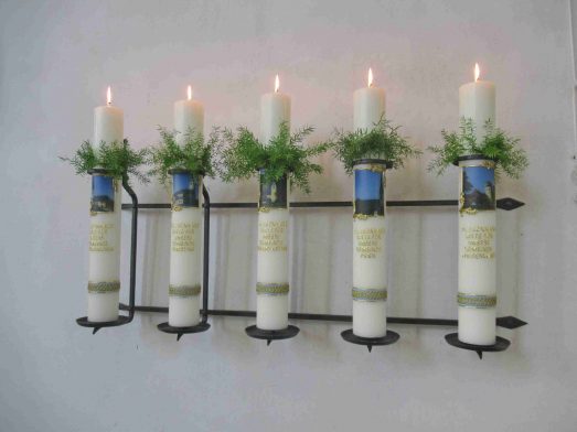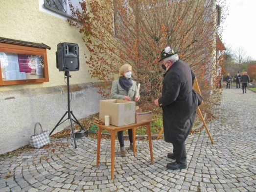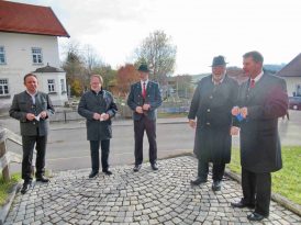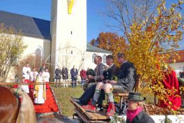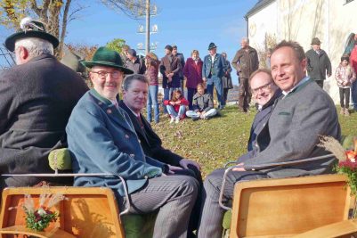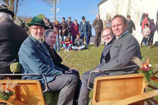 Ehe in Greimharting der Gottesdienst zum Kirchenpatrozinium beginnt ist es gute Tradition, dass fünf Verantwortliche des öffentlichen Lebens eine große Kerze in die Kirche tragen. Nachdem es diese Tradition schon lange vor der Gebietsreform im Jahr 1978 gab, werden die fünf Kerzen namentlich mit den Gemeinden Greimharting, Prien, Rimsting, Hittenkirchen und Wildenwart bezeichnet. Für diese Gemeinden waren heuer nach den Kommunalwahlen im letzten Jahr und nach dem Ausfall des Leonhardiritts im Vorjahr die Bürgermeister Andreas Fenzl (Rimsting), Andreas Friedrich (Prien) und Daniel Mair (Frasdorf) zusammen mit Gerhard Jell, der die ebenfalls neue Bürgermeisterin von Bernau Irene Biebl-Daiber vertrat, allesamt Gemeinde-Oberhäupter erstmals dabei – und allesamt waren sie angetan von der frommen Brauchtumspflege in Greimharting. Gemeinsam nahmen sie Platz auf der Ehrenkutsche von Sebastian Mayer, der auf dem Kutschbock von Bezirksrat und Bayernbund-Landesvorsitzenden Sebastian Friesinger begleitet wurde und der seinerseits als Verantwortlicher des nunmehr zu Ende gegangenen Rosenheimer Bauernherbstes resümierte: „Leonhardi beendet wieder die Bauernherbstsaison, in Greimharting wie immer in authentischer Weise, den stillen Kräften gilt mein Dank!“.