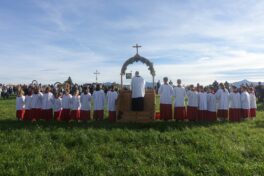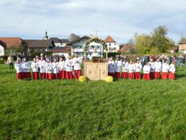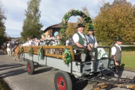 Den Segen für Pferde und Rosserer auf der freien Wiese erteilte Pfarrer Andreas Przybylski im Beisein eines großen Liturgischen Dienstes aus dem Pfarrverband „Selige Irmengard“. Am meisten mit Spannung erwartet wurde die Gold-Kutsche, die kürzlich von den ehrenamtlichen Bürgermeistern der Gemeinde Chiemsee Armin Krämmer und Kurt Lehner privat erworben wurde und beim heurigen Oktoberfestzug erstmals zum Einsatz kam. Als nach dem Segen die golden glänzende Kutsche immer noch nicht vor Ort war (wegen Stau auf der Anfahrt), da meinte der Geistliche humorvoll, dass es bei diesem Tempo nicht verwunderlich sei, dass es in Bayern keine Monarchie mehr gibt. In seinen Predigtworten sagte Pfarrer Przybylski: „Der Leonhardiritt ist mehr als ein traditioneller Ritt durch das Dorf, es ist eine berittene Prozession, die zeigt, dass die Menschen fest im Sattel in ihrem Glauben sind“. Nach dem Umritt kam es am Bauhof noch zu einer gemütlichen Einkehr, dabei unterhielten der Männergesangsverein Breitbrunn und die Musikkapelle Chieming.