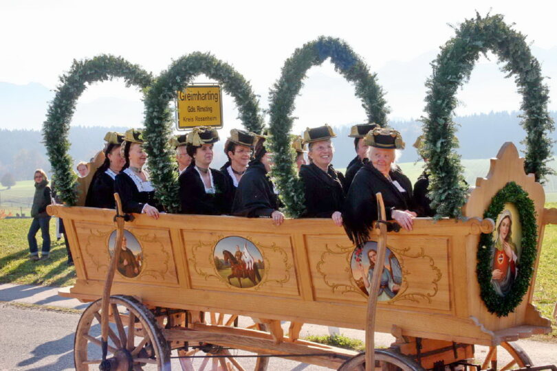 45 Gespanne und 30 Motivwagen hatten sich bei Organisator Hans Riepertinger angesagt. Beim feierlichen Patroziniums-Gottesdienst mit Weihbischof Dr. Franz Dietl und mit Monsignore Bruno Fink in der Filialkirche Greimharting wurde die neue Heiligen-Leonhard-Standarte geweiht. Der anschließende Leonhardiritt mit Segnung führte nicht nur zuerst um die Kirche, sondern wegen der vielen Teilnehmer bis nach Gänsbach, wieder zurück und um die Kirche, nochmals nach Gänsbach und letztlich zur Zugauflösung in Richtung Huben. Im Anschluss an den Umritt besteht war noch gemütliches Beisammensein auf dem Dorfplatz, beim Gröberwirt und im Gemeindehaus. Der Greimhartinger Leonhardiritt wird alljährlich am 6. November (Festtag des Heiligen Leonhard) mit Unterstützung der Gemeinde Rimsting, der Rosserer aus den Reihen der Kreuztracht Greimharting und aus den Nachbarorten sowie der katholischen Pfarrgemeinde Prien-Greimharting durchgeführt. (www.rimsting.de).