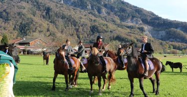 Leonhardiritt in Nußdorf an der St. Leonhardskirche: Mit dabei auch Nußdorf’s Bürgermeisterin Susanne Grandauer (ganz links auf dem Pferd).