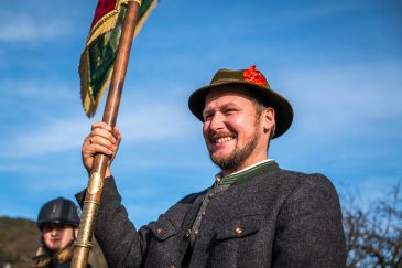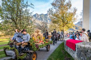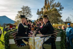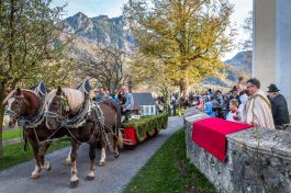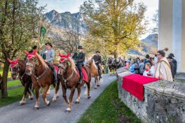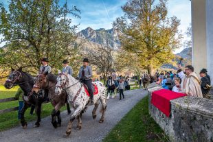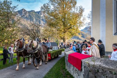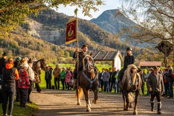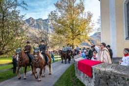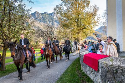 Farbiger Blätterwald am Heuberg, etwas Schnee auf der Hochries und am Fuße zahlreiche Gläubige, welche am Feldalter die Messe mitfeierten. Bläsergruppe und die Standarte des Leonhardiverein waren schmückendes Beiwerk um den festlich geschmückten Altar. Der Beistand des Hl. Leonhard wurde erbeten, verbunden mit dem Wunsch um Schutz für Tier und Mensch. Etwa 180 Rösser, Ponys und zahlreiche Kutschen mögen es gewesen sein.