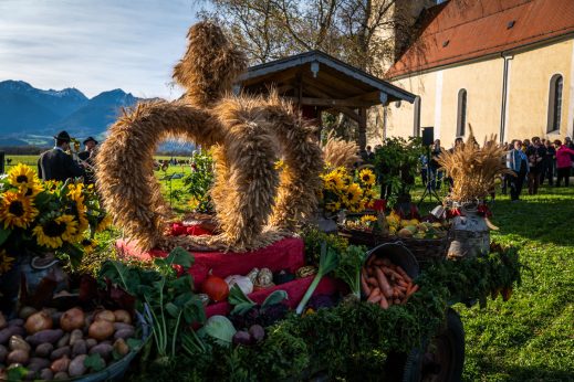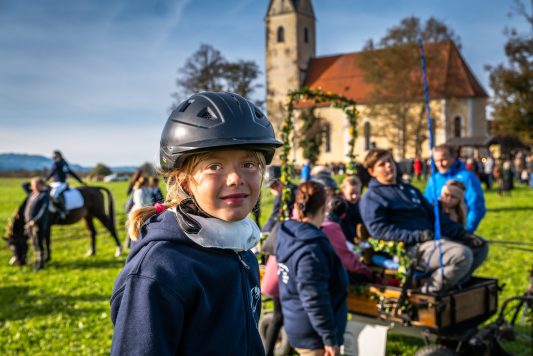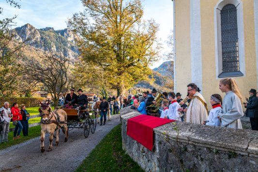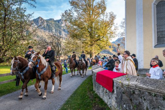 Heute erfreute uns strahlendem Sonnenschein, wenn auch etwas der Erler Wind blies. Ideales Wetter – gerade für die vielen Rosserer der Region. Denn heute, am 6. November, ist der Ehrentag des heiligen Leonhard von Limoges. Und das feierten die Nußdorfer, im Landkreis Rosenheim, mit einem prächtigen Leonhardiritt an der St. Leonhardskirche, dem weithin sichtbaren Wahzeichen Nußdorfs am Inn. Die Filialkirche St. Leonhard liegt außerhalb des Dorfes im Südwesten von Nußdorf. Übrigens, der weltberühmte Pilgerweg, der Jakobsweg, passiert diese Kirche.