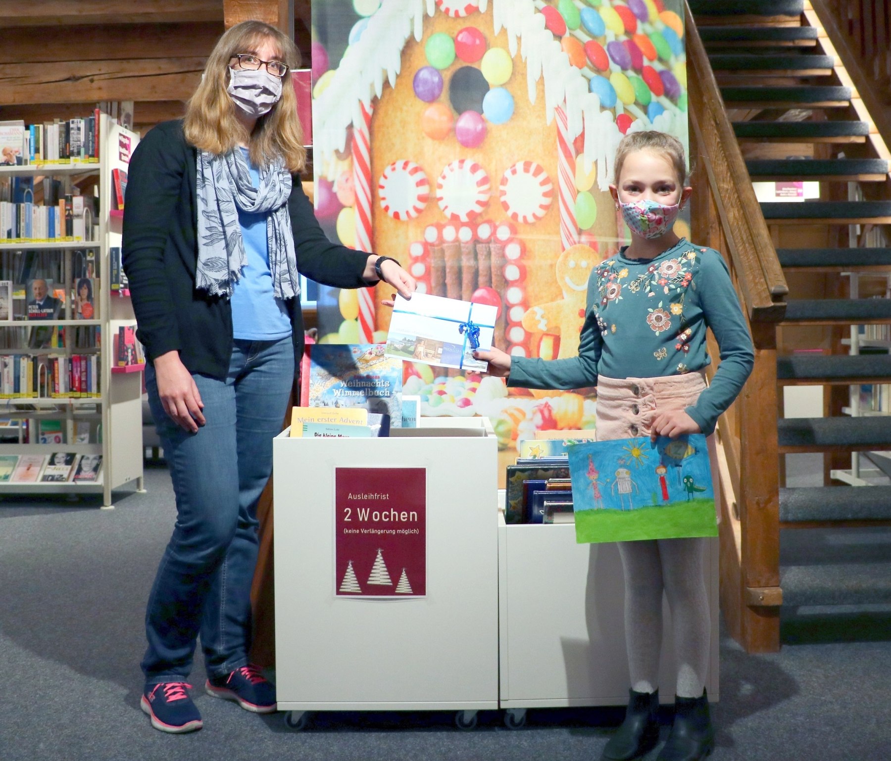 Büchereileiterin Christina Klasna überreicht den ersten Preis in der Kategorie „Malen“ an Anna Ruhsamer. Die achtjährige Künstlerin hat aus dem Buch „Ritter Rost und die Zauberfee“ von Jörg Hilbert ihre Lieblingsszene gemalt.