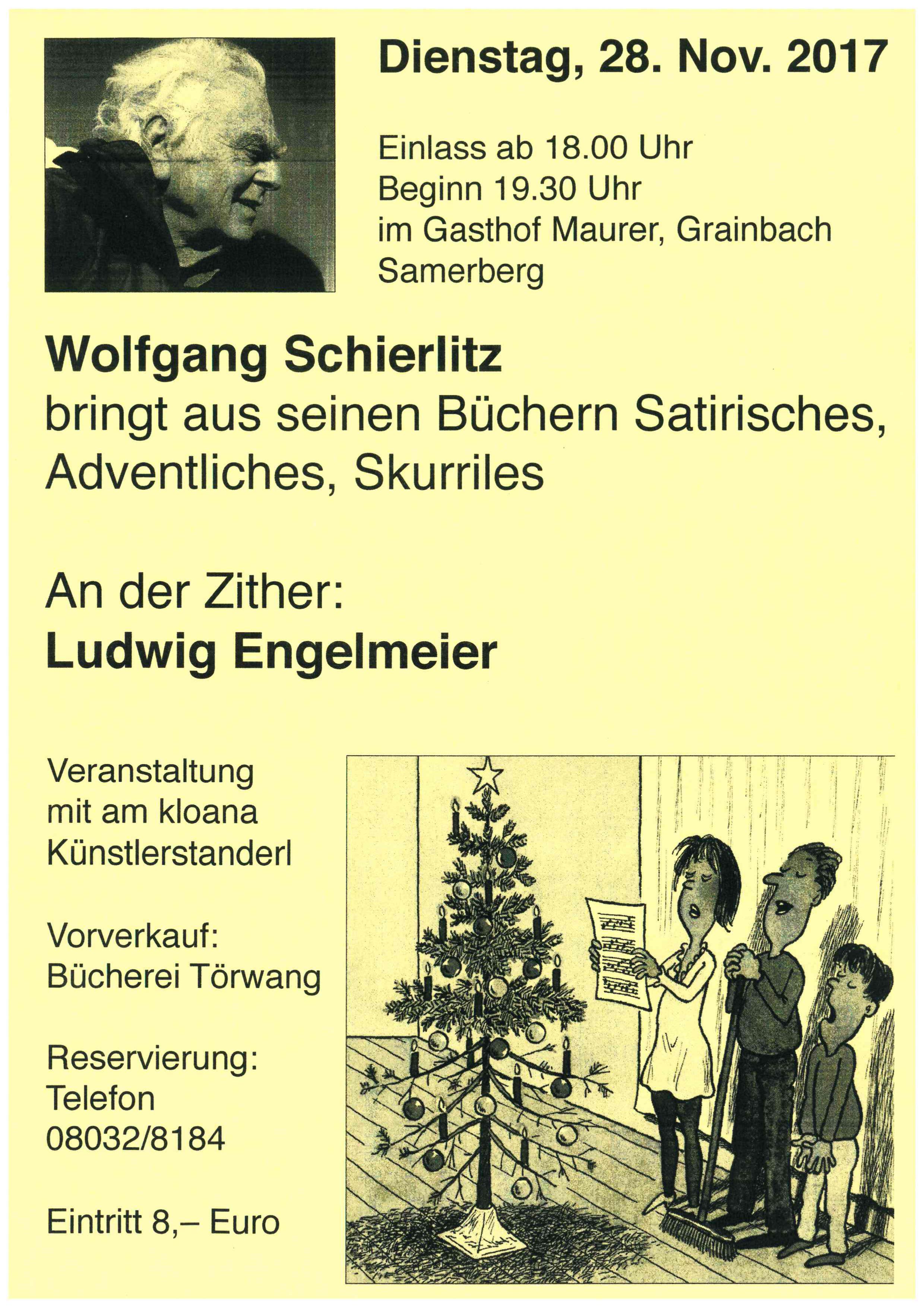 Eine Lesung mit Wolfgang Schierlitz aus seinen Büchern mit Satirischem, Adventlichem und Skurrilem findet am Dienstag, 28. November im Gasthof Maurer in Grainbach am Samerberg statt. An der Zither spielt Ludwig Engelmeier. Karten gibt es im Vorverkauf in der Bücherei Törwang, Reservierungen sind unter der Telefon-Nummer 08032-8184 möglich.