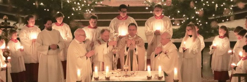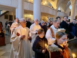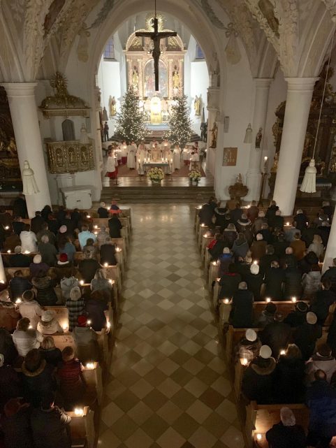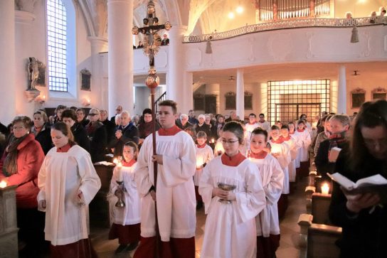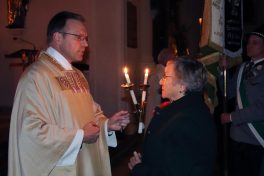 Als einzige der über 600 Pfarreien im Erzbistum München und Freising feiert Aschau im Chiemgau sein Kirchenpatrozinium vierzig Tage nach Weihnachten, dem Festtag „Darstellung des Herrn“. Dieser ganz besondere Tag im Kirchenjahr, wurde mit einem Festgottesdienst und Kerzenweihe gefeiert. An diesem Tag wird im Besonderen die Gottesmutter Maria gefeiert, die als Lichtgeberin gilt, was in dem alten Namen „Mariä Lichtmess“ zum Ausdruck kommt. Auch die Fahnenabordnungen der örtlichen Vereine waren mit dabei. Zelebranten, Kinder und Ministranten zogen in einer Lichterprozession unter Gesängen zum durch die Kirche zum Altar. Neben den weihnachtlichen Lichterbäumen lenkten Scheinwerfer die Blicke auf das frühbarocke Altarbild. Kirchenchorleiterin Christine Klinger hat zum großen Fest extra aus der Sachranger Notensammlung die „Missa in F“ von Pater Edmund Angerer OSB für Chor und Orchester einstudiert. Zum Abschluss des Gottesdienstes gab es für die Gläubigen noch den ganz besonderen Blasius-Segen. Ortspfarrer Paul Janßen hat zwei gekreuzte brennende Kerzen vor die Gläubigen gehalten und dabei den Segen gespendet, der vor Halskrankheit und allem Bösen bewahren soll. Nach dem Festgottesdienst wurden zum Danke-Essen durch den Pfarrverband die Ehrenamtlichen und Bediensteten der Pfarreien eingeladen.