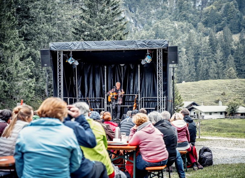 Mit seiner aktuellen Solotour „Bei mir“ war der Liedermacher Werner Schmidbauer zu Gast an der Mittelstation der Hochfelln-Seilbahn in Bergen. Das Konzert war ein weiterer Höhepunkt der Feierlichkeiten zum 50-jährigen Jubiläum der Hochfelln-Seilbahn in diesem Jahr. Werner Schmidbauer, der vielen Zuschauern auch aus der Fernsehsendung „Gipfeltreffen“ bekannt ist, begeisterte das Publikum an der Mittelstation mit seinem Auftritt. Nach 35 Jahren als Liedermacher und nach 22 Jahren im Duo mit Martin Kälberer, sei es ihm ein großes Bedürfnis mit seinen Liedern endlich mal alleine auf der Bühne zu stehen, erzählte Schmidbauer. Er wolle seine Lieder einfach pur also nur mit Gitarre und Gesang wiedergeben. Er sei bei sich angekommen und will aber auch noch viel näher am Publikum sein. Dies ist ihm am Hochfelln hervorragend gelungen. Es herrschte schon fast Wohnzimmeratmosphäre als Schmidbauer, seine Lieder präsentierte, die teilweise sehr persönlich und emotional waren, wie zum Beispiel bei dem Song in dem er den Tod seines Vaters, der in den Bergen verunglückt ist, zu verarbeiten versuchte. Auch der Titel „wo bleibt die Musik“ der bereits 2014 veröffentlicht wurde, erhielt durch das Corona-Geschehen der letzten beiden Jahre neue Aktualität. Werner Schmidbauer zeigte sich von der einmaligen Atmosphäre an der Mittelstation begeistert und versprach sicher noch einmal wiederzukommen.