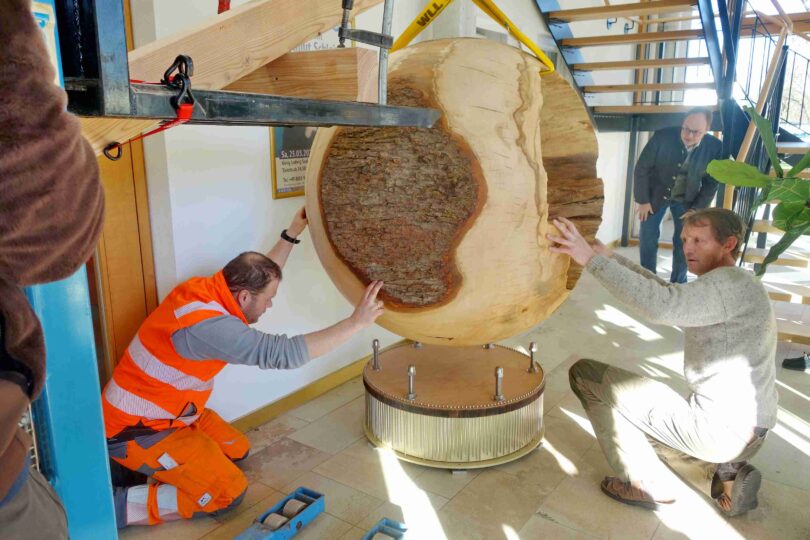 Künstler des rund 200 Kilogramm schweren und gedrechselten Werkes mit einem Durchmesser von 1,32 Metern und auf einem aufwendig gestalteten Sockel ist der Schreiner Stefan Rauch aus Eggstätt.