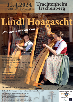 Einlass und Bewirtung beim Lindl-Hoagart beginnen um 18 Uhr, der Kartenpreis beträgt 15€. Karten sind im Vorverkauf erhältlich, entweder bei Christa Prochazka unter der Telefonnummer +49 176 47745834 oder per E-Mail an sunnaschein.harfenduo@gmail.com.