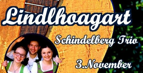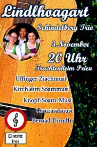 Am Freitag, 3. November findet im Priener Trachtenheim der letzte Lindlhoagart des Jahres statt. Ausrichtende Gruppe ist das Schindelberg Trio, das beim Lindl-Singen 2016 erfolgreich teilgenommen hat. Es haben sich namhafte Gruppen angekündigt, unter anderem werden die Oimräsal Musi, die Uffinger Ziachmusi sowie die Kirchleitn Soatnmusi den Abend musikalisch gestalten. Der Eintritt ist frei.