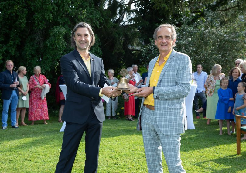 Bei wunderschönem Sommerwetter ermöglichte das Garden-Hotel Reinhart dem Lions Club Prien im traumhaften Garten die turnusgemäße Amtsübergabe des bisherigen Präsidenten Peter Hirblinger an den neuen Amtsinhaber Alexander Simon. Das vergangene Jahr war von Corona deutlich geprägt. Es konnten nur drei Präsensveranstaltungen stattfinden. Die restlichen Clubabende mit sehr interessanten Themen fanden per Video-Konferenz statt. Peter Hirblinger berichtete in seiner Übergaberede darüber und führte anschließend mehrere Ehrungen durch. Der scheidende Sekretär Jörg Hofmann wurde mit dem GOVERNOR APPRECIATION AWARD für seine hervorragende Arbeit ausgezeichnet. Die Ehrenurkunde für 35 Jahre Mitgliedschaft im Lions Club Prien bekam Dr. Fritz Daumiller, das Ehrenmitglied Romano Dubbini sowie Gottfried Richter. Seit 30 Jahren gehört Dr. Peter Hattenkofer dem Lions Club Prien an. Er ist das wichtige Bindeglied zum Lions Club Valdagno. Weitere Ehrenurkunden erhielten Eric Zbil, 25 Jahre, Engelbert Stephan und Bernd Jucht, für 20 Jahre sowie Michael Körner für 10 Jahre Mitgliedschaft. Am Ende seiner Rede betonte Peter Hirblinger den guten Kontakt zu den vielen Lions Clubs im In- und Ausland, deren Gründungspate der Priener Club ist. Nach der Übergabe der Amtsglocke an den neuen Präsidenten hielt dieser eine sehr erfrischende Rede über seine Vorhaben im neuen Amtsjahr. Er hofft sehr, nach dem sehr schwierigen Pandemie-Jahr 20/21, auf die Unterstützung aller Mitglieder. Er erwartet, dass sich die Clubmitglieder an der Gestaltung der Clubabende beteiligen, die sich um Ressourcen und Nachhaltigkeit drehen sollen. 80% des Ergebnisses benötigen 20% Energieaufwand. Sein Motto ist „Lions soll Spaß machen“. Seine letzten Worte waren „Lasst uns mutig und freundlich sein und was sehr Gutes machen“.