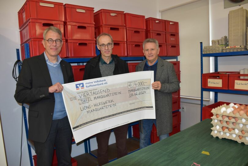 Marquartstein – Regelmäßig spendet das Lions-Hilfswerk Marquartstein-Achental für die Tafel. Die Achtal Tafel versorgt seit zwanzig Jahren Menschen mit geringem Einkommen einmal wöchentlich mit Lebensmitteln. Die Tafelleitung hat Diakon Michael Soergel. Er erzählt, dass Betroffene aus dem gesamten Achental kommen, rund 70 Haushalte, zirka 158 Menschen, die jede Woche das Angebot nutzen müssen. Die Tafel bietet saisonale Lebensmittel, die von verschiedenen Verkaufsstellen, wie Supermärkte, Bäcker, regionale Geschäfte und privaten Spendern zur Verfügung gestellt werden. Wenn nicht genügend Artikel da sind, können Lebensmittel dazu gekauft werden. Das ist möglich durch Spenden, die die Tafel erhält, zum Beispiel vom Lions Club. In diesem Jahr übergaben der Vorsitzende Toni Ager und Roland Netzer (Mitglieder-Beauftragter) einen symbolischen Scheck in Höhe von 4 000 Euro an Michael Soergel. Der Diakon freute sich, dass damit die Arbeit für die Tafel unterstützt wird, die nur durch die ehrenamtlich Tätigen möglich ist.
