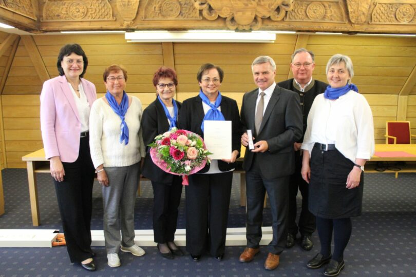 Im Beisein von Vorstandschaftskolleginnen des KDFB Hohenthann, Pfarrer Michael Birner (2. v. r.) und Hohenthanns Erste Bürgermeisterin Andrea Weiß (l.) überreichte Landrat Peter Dreier (3. v. r.) bei einer kleinen Feierstunde im Landratsamt Landshut Frau Sabine Kermer-Prelicz (Mitte) das Ehrenzeichen.