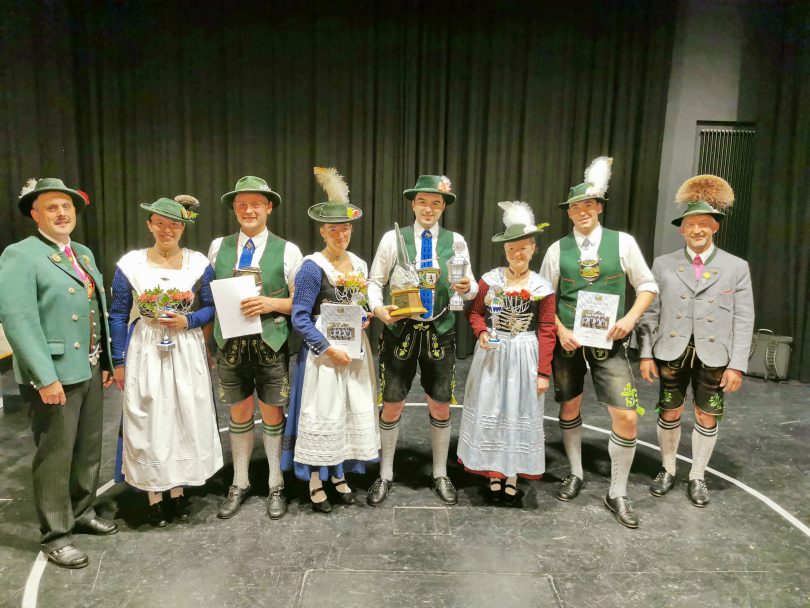 Die drei ersten Plätze der Aktivengruppen (von links nach rechts) 2.Gauvorstand Philipp Bodenburg 3.Platz “Veiglbergler” Neufahrn II; 1.Platz “D´Loisachtaler” Wolfratshausen”, 2.Platz “Almrösl” Hohenschäftlarn I, 1.Gauvorstand Sepp Ponholzer