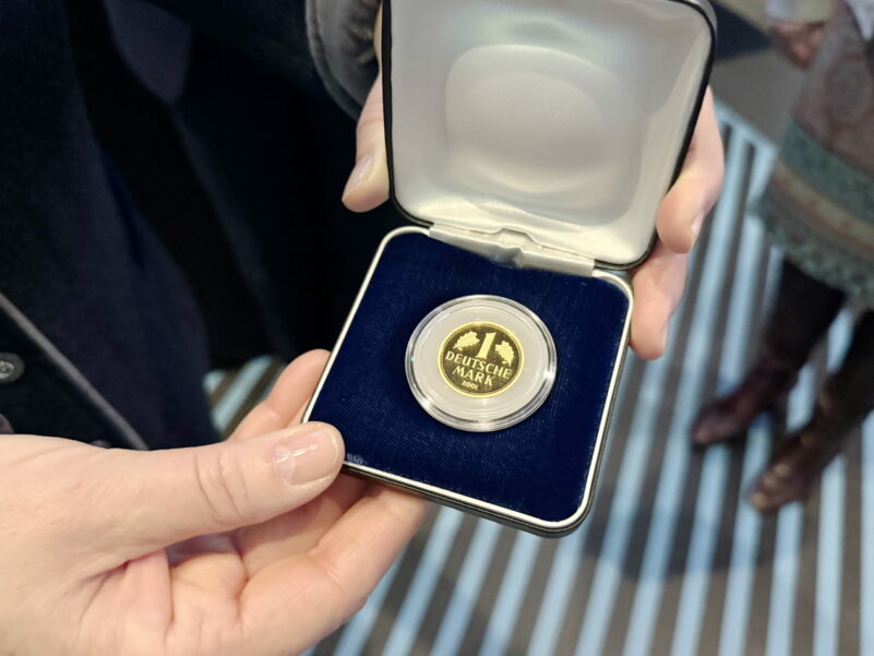 Ausstellungen im Lokschuppen hatte Frau Hessen als ehemalige Lehrerin bereits sehr viele besucht. „Die ‚HELDINNEN & HELDEN‘-Ausstellung hat mir sehr gefallen, wobei mir vor allem wichtig war, dass meine Enkelin Spaß hat“, so Hessen. Diese war extra aus Südafrika angereist, um ihre Großmutter zu sehen. Ein besonderes Highlight für die beiden: Nelson Mandela (als Skulptur ausgestellt), über den die Enkelin kurz zuvor ein Schulreferat gehalten hatte. „Die Münze bekommt meine Enkelin, wenn sie alt genug ist. So lange verwahren mein Mann und ich die sie“, verriet Hessen. Die gemeinsame Runde war sich einig, dass sich die Enkelin sicherlich sehr freuen wird – wesentlich mehr als über einen Bitcoin. Ausstellungsleiterin Jennifer Morscheiser scherzte: „Ein Bitcoin wäre auch schwer zu übergeben. Herzlichen Glückwunsch, hier haben wir einen USB-Stick mit Zugang zu einem Wallet.“